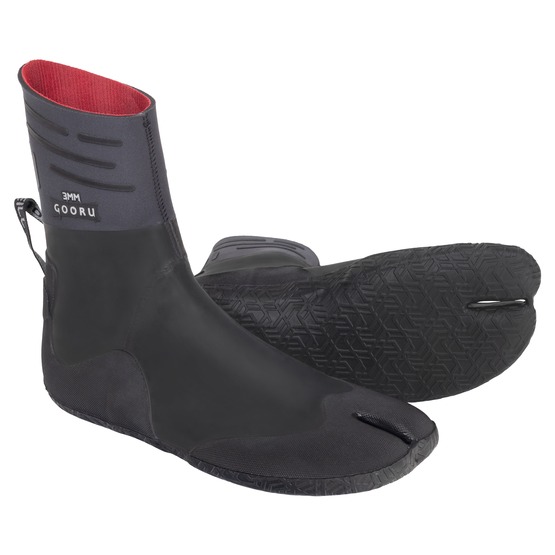 Gooru Dipped 3 mm ST to wysokie buty neoprenowe z wydzielonym dużym palcem (Split Toe), który zapewnia lepszą przyczepność, stabilność i kontrolę nad deską. Częściowo pokryte płynnym neoprenem. Solidna podeszwa, zwężana cholewka, pętelka na pięcie. Wnętrze w technologii TB4 Firewall z domieszką grafenu.