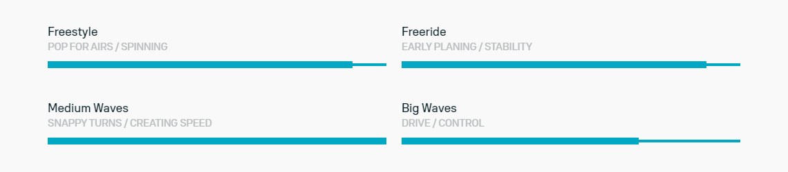 Połączenie linii rockera z kanałami na dnie deski szybko budują prędkość, co przydaje się zarówno na małych ciasnych falach, jak i przy podniebnych ewolucjach