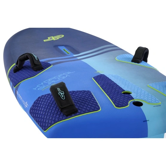 Duża liczba insertów do footstrapów – Pojedyncze inserty przyspieszają proces ustawiania i zmian pozycji footstrapów pomiędzy wyścigami! Duża ilość insertów natomiast pozwala na szeroki zakres regulacji i dostosowań ustawień footstrapów w zależności od wykorzystywanych foili, długości fuselage czy zmieniających się warunków wiatrowych. To wszystko sprawia, że można deskę ustawić naprawdę pod siebie.Naturalnie wszystkie deski JP-Australia HydroFoil Slalom wyposażone są w wytrzymałe i gwarantujące pewność skrzynki Foil-Tuttlebox. Każda deska otrzymała również w środkowy pad na rufie, który został wyprofilowany, by naturalnie dopasowywał się do stopy i zapewniał wsparcie zarówno podczas startów, jak i ruf.