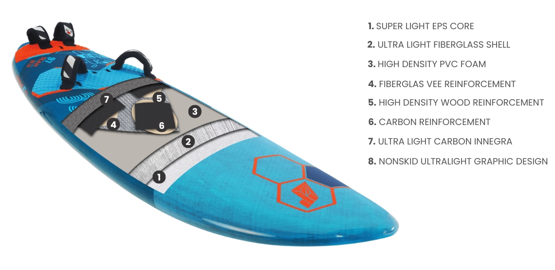 Zaktualizowany rocker bez tail kick’a, krótsza konstrukcja (przy zachowaniu tej samej szerokości) oraz nowy rozkład wyporności. Wszystkie te zmiany mają na celu zmaksymalizowanie mocy w warunkach lekkiego wiatru oraz zapewnienie doskonałego przyspieszenia i szybkości reakcji, przy jednoczesnym zachowaniu wyjątkowej zwrotności deski.