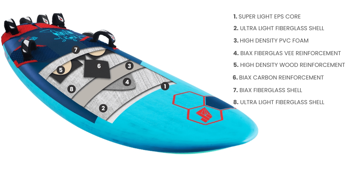 Wysoki rocker zapewnia bardzo szybki start i płynne lądowanie, gdy pływasz na foilu oraz świetną kontrolę podczas pływania z finem (co docenisz zwłaszcza na chopie). Szeroka rufa da Ci stabilność w szybkich ślizgach z finem, a w windfoilingu pozwoli lepiej dociążyć krawędź i zrównoważyć foila.