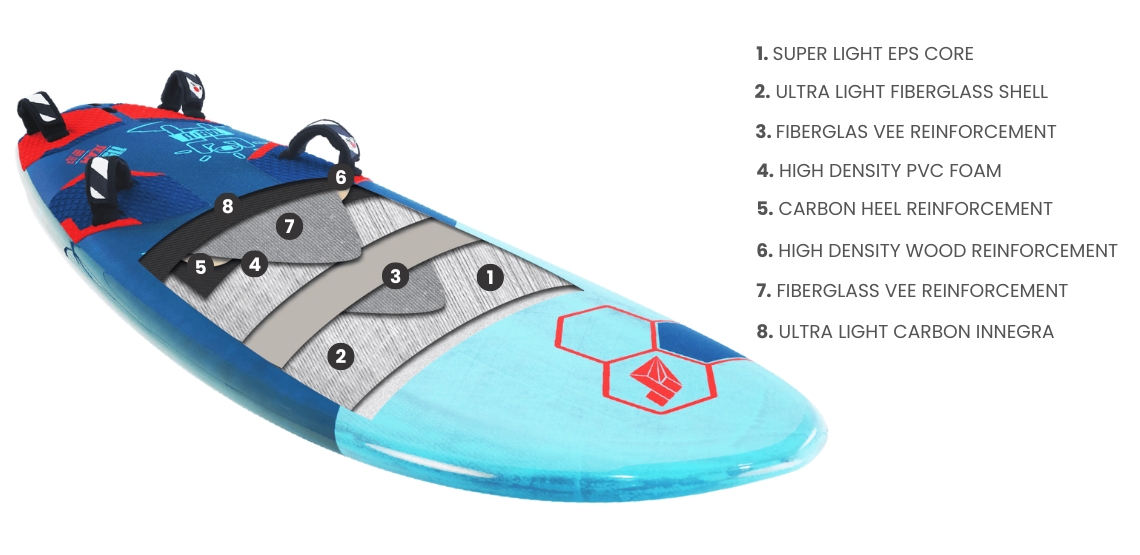 Profil pokładu został zaprojektowany tak, by zagwarantować Ci maksymalnie komfortową pozycję zarówno na foilu, jak i na finie