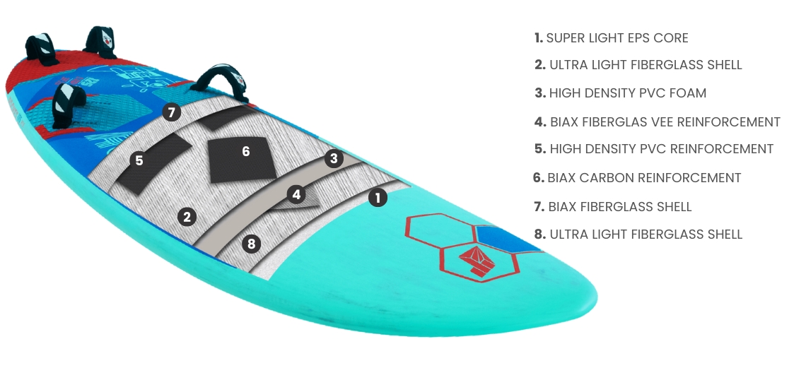 Niezależnie od poziomu zaawansowania i warunków na wodzie każdy rider znajdzie komfortową pozycję na desce – a to za sprawą licznych insertów na footstrapy. Dzięki nim początkujący z łatwością zaliczą pierwsze ślizgi, a zaawansowani riderzy wyciągną maksimum prędkości z każdego szkwału.