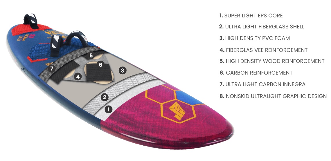 | Wyporność (l) | Długość (cm) | Szerokość (cm) | Waga (kg) | Zalecany rozmiar żagla | Typ skrzynki statecznikowej | Dołączone stateczniki | Foil ready |