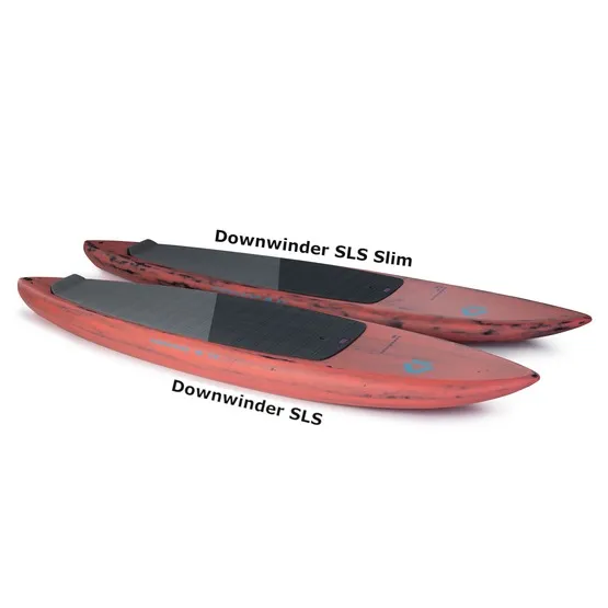 Downwinder SLS ma niski rocker i spiczastą rufę co gwarantuje szybki start. Czysty profil dna z pojedynczą wklęsłością w przedniej części ułatwiają ustanie przyziemienia, a wyraźne skosy krawędzi z ostrym zakończeniem tylnej połowie deski zapewniają doskonały przepływ wody i stabilność. Lekko zagłębiony pokład poprawia połączenie z foilem, a nowe, dłuższe foil tracki z włókna węglowego zapewniają możliwość regulacji dla wszystkich rodzajów folii, jednocześnie zmniejszając wagę.