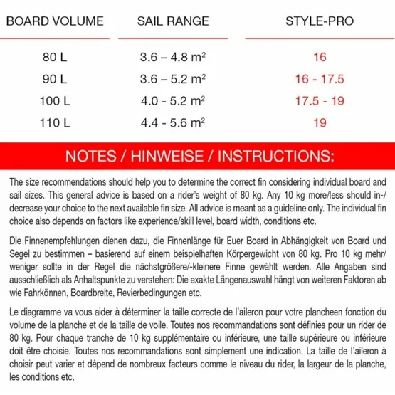 Style-Pro uzupełnia paletę freestyle’owych stateczników MUF. Większa powierzchnia i cieńszy profil pozwalają na wczesne wejście w ślizg, bardzo wysoką prędkość i wysokie wyskoki do ekstremalnych trików w powietrzu. Idealny statecznik do „nowej szkoły freestyle’u”.