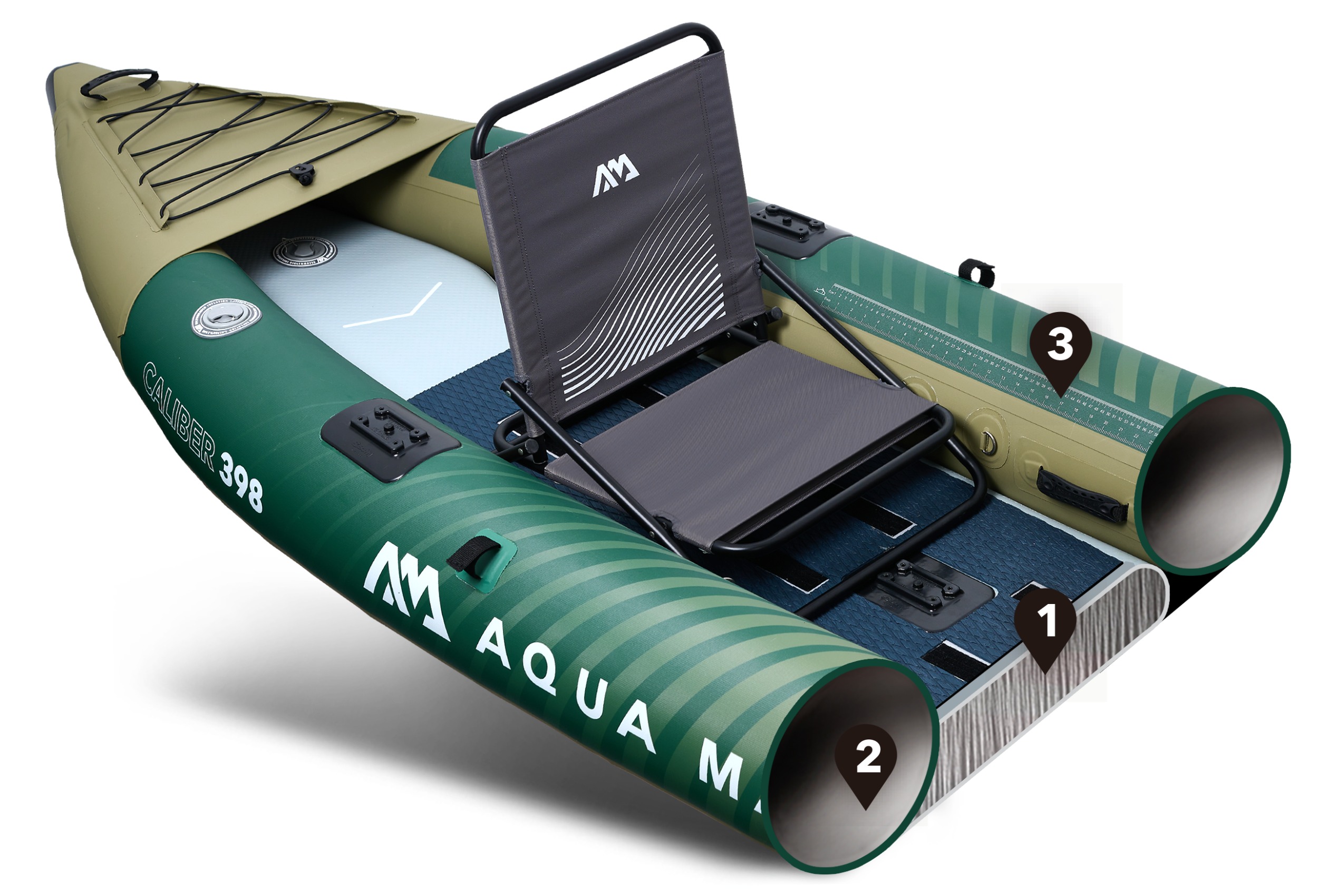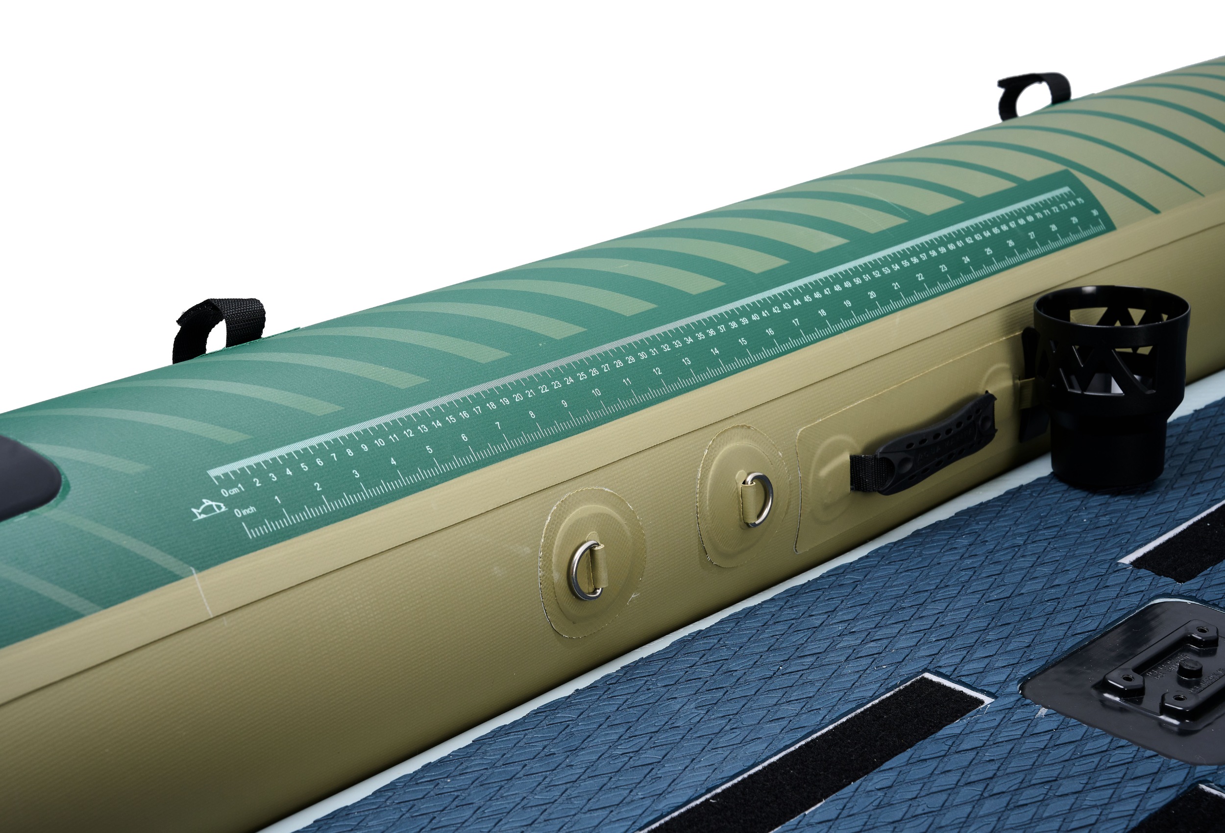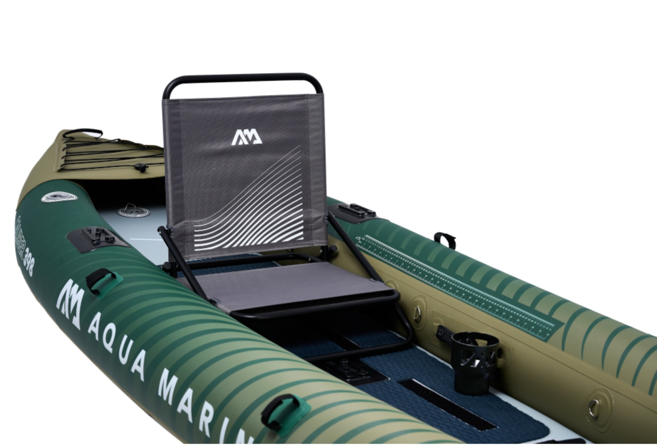 Konstruktorzy zadbali w 100 % o wygodę podczas wędkowania. Kajak wyposażony jest w 1 wygodne, składane krzesełko, ale ma też możliwość przekształcenia go w kajak 2-osobowy. Dla dodatkowego komfortu umieszczono podnóżki. Jego szerokość to prawie 1 metr. Dzięki wyjmowanej, dmuchanej podłodze możesz łowić na stojąco i czuć się stabilnie.