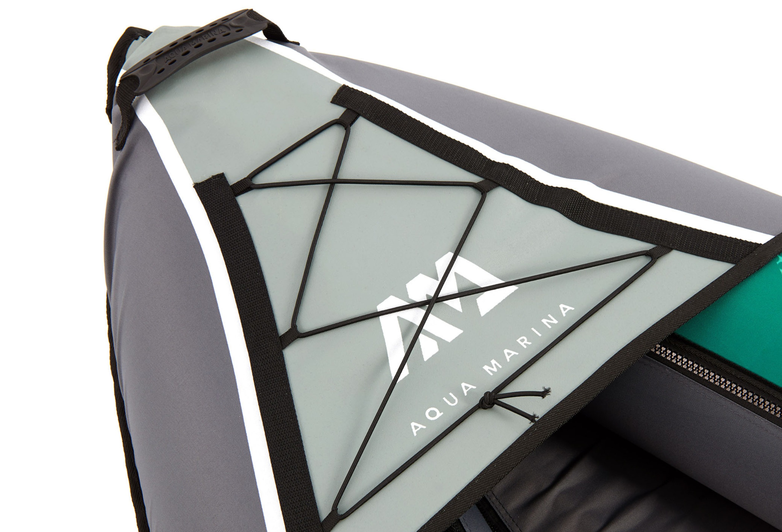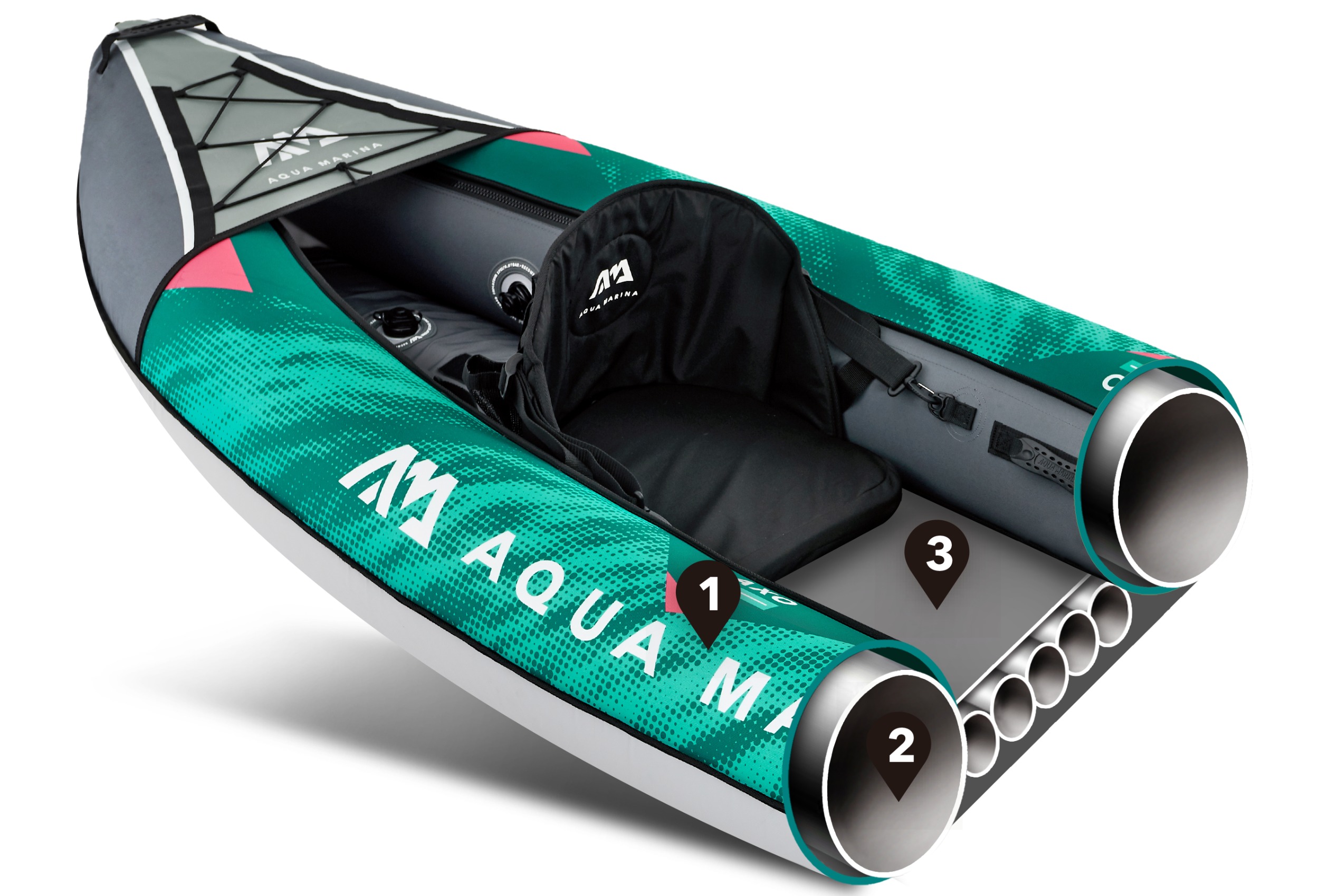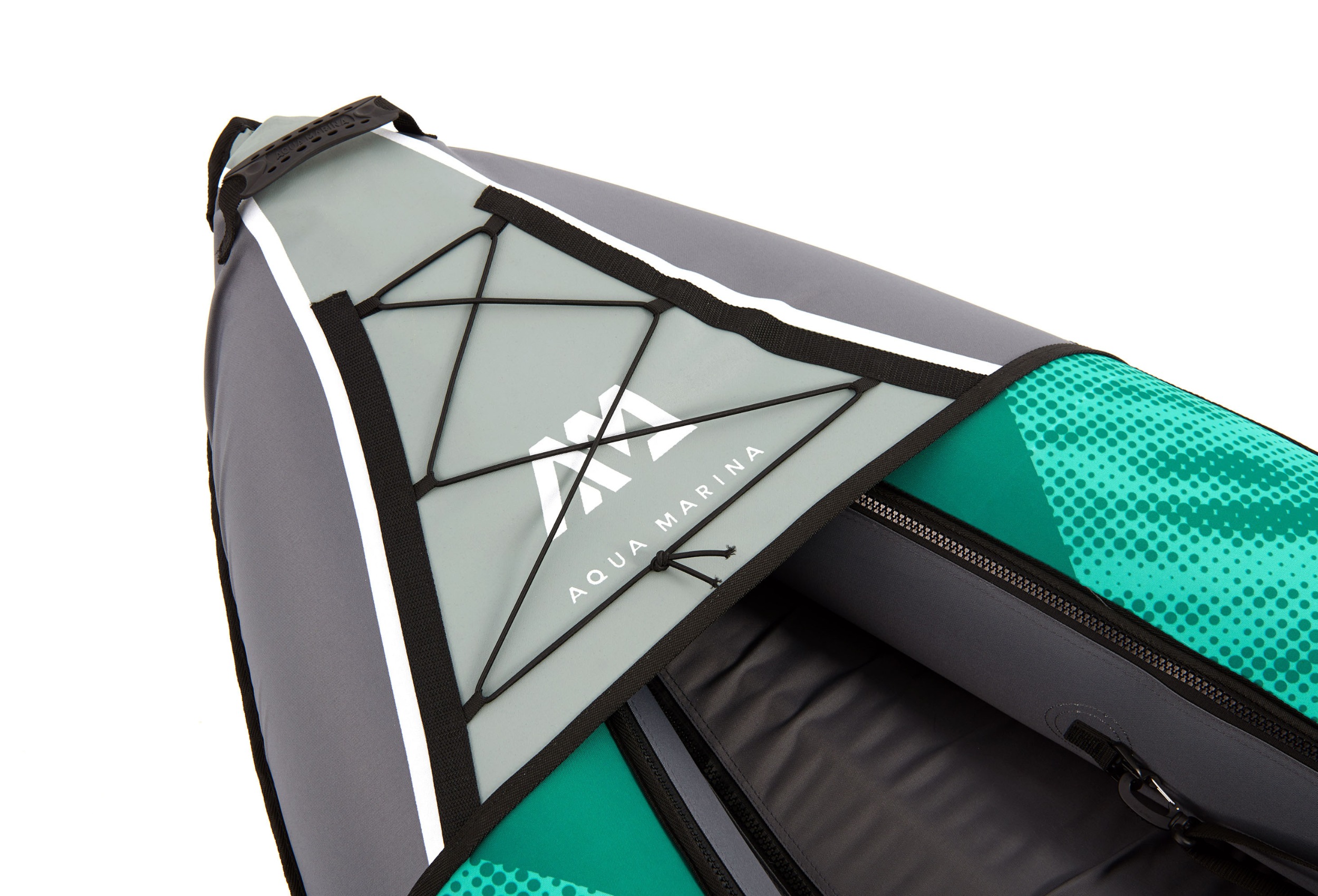 Kajak został wykonany z wielowarstwowego wytrzymałego materiału PVC. Składa się z 3 nadmuchiwanych komór powietrznych. Dwie boczne dają poczucie bezpieczeństwa, a szeroka podłoga zapewnia komfortową przestrzeń oraz dużą stabilność. Aqua Marina wykorzystała Aquashell™ Technology, która sprawia, że materiał jest hydrofobowy i posiada specjalną powłokę chroniącą przed promieniowaniem UV. Dodatkowo technologia Eco-print™, czyli technika druku cyfrowego gwarantująca trwałość grafiki i przyjazność samego procesu dla środowiska.