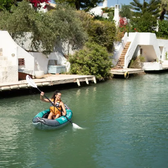 Kajak wyposażony jest w wygodne, regulowane siedzisko, które w łatwy sposób zamontujesz do uchwytów D-buckle. Na dziobie i rufie znajduje się system linek Cargo bungee, gdzie schowasz niezbędny Ci bagaż. Na przodzie kajaka umieszczono osłonę Splash Guard, która uchroni przed wlewaniem się wody na pokład. Kajak wyposażony jest w uchwyty do przenoszenia. Natomiast system dwóch stateczników zapewni mu stabilność kursu. Pokład posiada zawór, dzięki któremu szybko odprowadzisz wodę z kajaka. W zestawie znajdziesz aluminiowe, 4-częściowe wiosło KP-1.