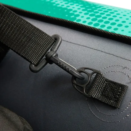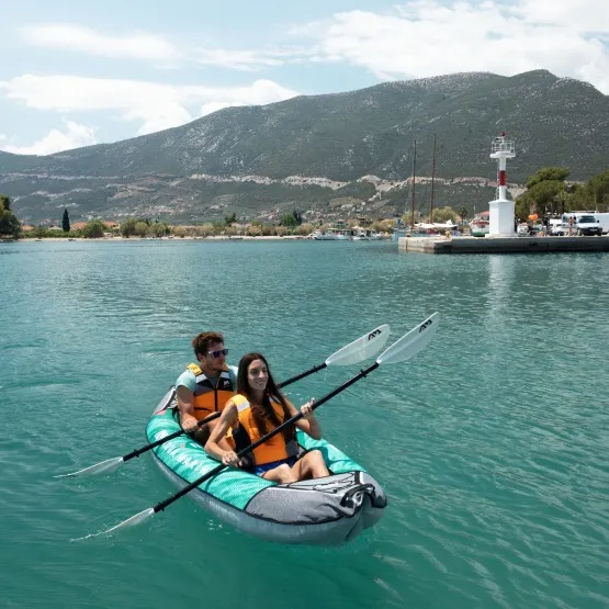 Kajak wyposażony jest w wygodne, regulowane siedziska, które w łatwy sposób zamontujesz do uchwytów D-buckle. Na dziobie i rufie znajduje się system linek Cargo bungee, gdzie schowasz niezbędny Ci bagaż. Na przodzie kajaka umieszczono osłonę Splash Guard, która uchroni przed wlewaniem się wody na pokład. Kajak wyposażony jest w uchwyty do przenoszenia. Natomiast system dwóch stateczników zapewni mu stabilność kursu. Pokład posiada zawór, dzięki któremu szybko odprowadzisz wodę z kajaka. W zestawie znajdziesz dwa aluminiowe, 4-częściowe wiosło KP-1.