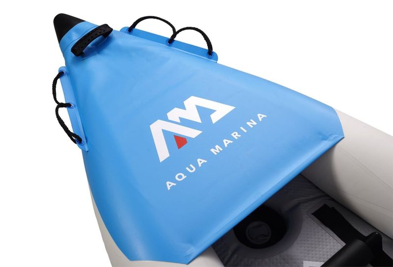 Na rufie znajduje się system linek Cargo bungee, gdzie schowasz niezbędny Ci bagaż. Na przodzie kajaka umieszczono osłonę Spalsh Guard, która uchroni kajak przed wlewaniem się wody na pokład. Jednak podczas raftingu nie ma szans, żeby uchronić w 100% pokład przed zalaniem, dlatego kajak posiada zawory spustowe, dzięki którym szybko spuścisz wodę z dna.