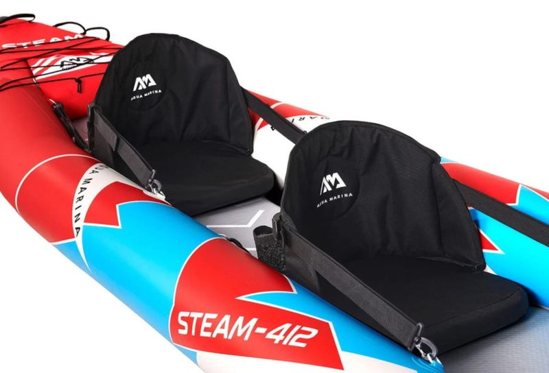 Kajak wyposażony jest w wygodne, regulowane siedzisko, które w łatwy sposób zamontujesz do uchwytów D-ring, Twoje plecy będą miały solidne oparcie. Dla większego komfortu podczas wiosłowania dodane są wyjmowane podnóżki. Steam na dziobie i na rufie ma dodatkowo twarde wzmocnienie 'nose protection’, które chroni kajak przed uszkodzeniem podczas ekstremalnych spływów.