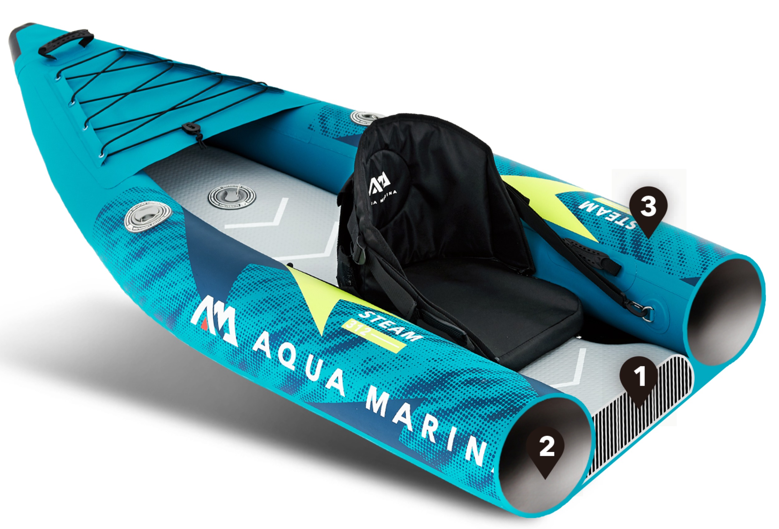 Konstrukcja to 3 niskociśnieniowe komory wykonane z wielowarstwowego, wytrzymałego materiału DWF PVC. Dno Steam’a o grubości 7 cm pompowane jest osobno, wykonane zostało w technologii DropStitch, która zapewnia wyjątkową sztywność, czyli świetną stabilność.