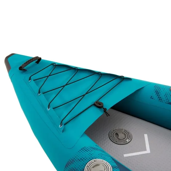 Na rufie znajduje się system linek Cargo bungee, gdzie schowasz niezbędny Ci bagaż. Na przodzie kajaka umieszczono osłonę Deck Shield™, która uchroni kajak przed wlewaniem się wody na pokład. Jednak podczas raftingu nie ma szans, żeby uchronić w 100% pokład przed zalaniem, dlatego kajak posiada zawory spustowe, dzięki którym szybko spuścisz wodę z dna. Kajak wyposażony jest w wygodne rączki do przenoszenia. System dwóch wysokowydajnych stateczników zapewni mu stabilność kursu.