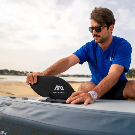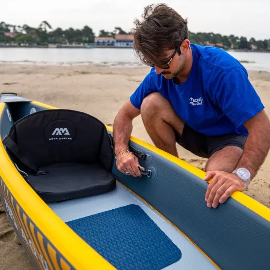 Aqua Marina zadbała w 100% o wygodę. W zestawie znajdziesz regulowane siedzisko kajakowe z wysokim oparciem, gąbczastą poduszką i wieloma kieszeniami do przechowywania, regulowany podnóżek oraz pokład pokryty pianką EVA dla komfortu podczas wiosłowania. Transportowanie kajak nad wodę ułatwią uchwyty do przenoszenia umieszczone na dziobie i rufie.