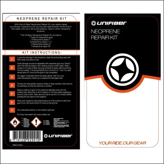 Z zestawem do naprawy neoprenu marki Unifiber możesz z łatwością załatać wszystkie przetarcia, przecięcia i dziurki w Twojej piance. Zawiera on łatki neoprenowe różnego kształtu i rozmiaru oraz czarny specjalistyczny klej, elastyczny i bardzo wytrzymały. Uszczerbek pianki może zdarzyć się w każdym momencie, warto go naprawić od razu, aby dziurka/przecięcie nie powiększało się. Będziesz mógł spędzić więcej czasu na wodzie w ulubionym kombinezonie, kamizelce czy rękawiczkach.