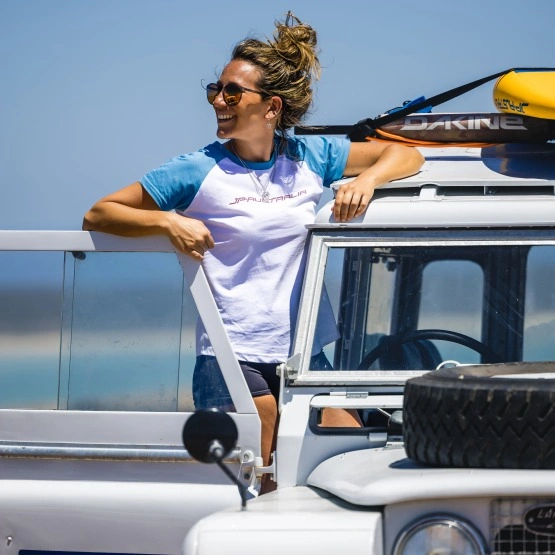 Damska koszulka JP-Australia Backprint w kolorze biało-niebieskim. Wykonana w 100% z bawełny, która jest miękka, lekka i oddychająca, co sprawia, że ta koszulka jest wygodna w noszeniu, zwłaszcza w ciepłe dni.
