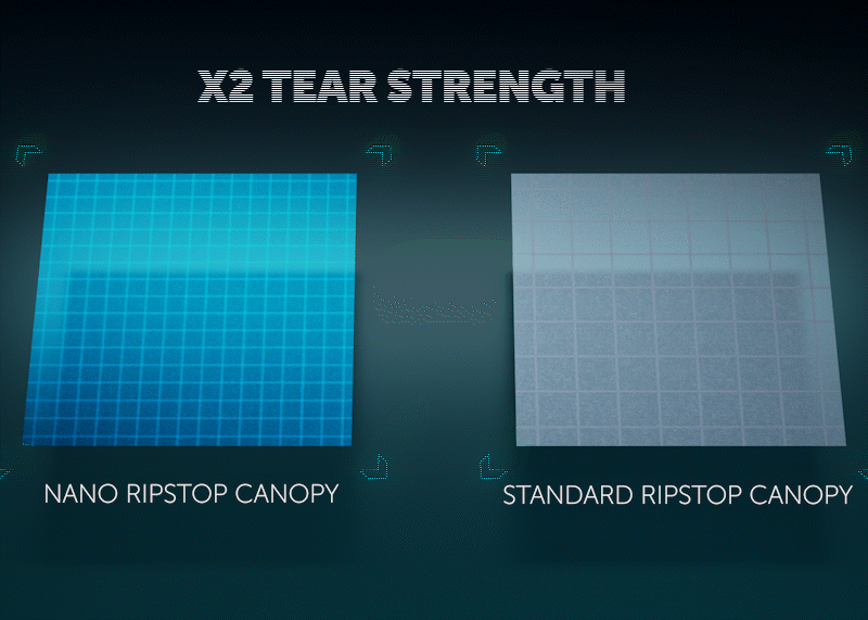 krotny wzrost wytrzymałości czaszy na rozdarcie. Większa gęstość włókien rip stop zwiększa ilość „komórek” w danym panelu.