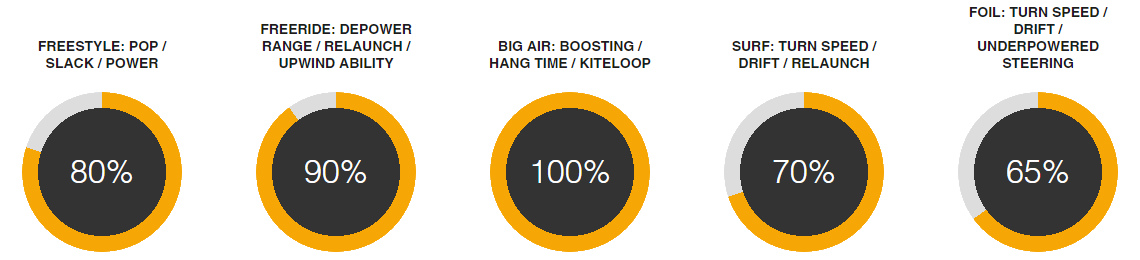 Mocny, dobrze wyważony i responsywny, co pozwala na szalone skoki i bezpośrednie, potężne kiteloopy.