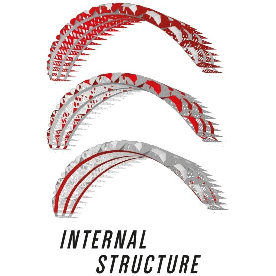 Wnętrze latawca zostało zaprojektowane specjalnie, aby zmaksymalizować stabilność i sztywność, a także zmniejszyć zapotrzebowanie na punkty mocowania linek. Paski napinające biegnące wzdłuż dolnej warstwy komór są technicznym detalem zapożyczonym z projektu Twinskin/Arc i zapewniają odpowiednie wybrzuszenie dolnej powierzchni latawca, jednocześnie utrzymując napięcie w ryzach. Sprytnie umieszczone żebra D i H pozwalają na równomierne