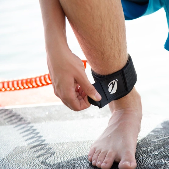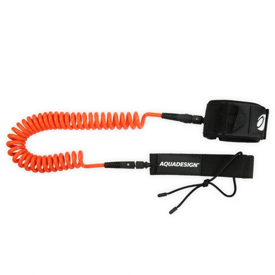Aquadesign Coiled to leash do deski SUP ze skręcaną linką wykonaną z wytrzymałego tworzywa. Przypinany do kostki za pomocą wygodnej neoprenowej opaski zapinanej na rzep. Długość leasha: 10′ (ok. 305 cm)