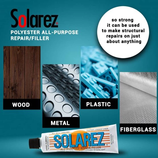 SOLAREZ to mieszanka wysokowytrzymałej żywicy poliestrowej wzmocnionej włóknami i niezwykłego katalizatora aktywowanego energią słoneczną. SOLAREZ pozostaje w stanie płynnym, dopóki nie padnie na niego bezpośrednie światło słoneczne. Wystarczy nałożyć go w cieniu, a następnie wystawić na działanie promieni słonecznych i gotowe! Szybko naprawia: włókno szklane, drewno, metal i tworzywa sztuczne (z wyjątkiem styropianu).