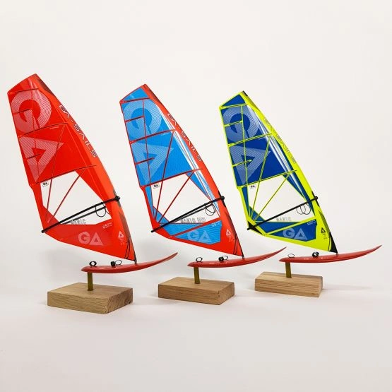 Każdy model został bardzo realistycznie odtworzony w skali 1:16 na podstawie oryginalnych desek i pędników. Żagle zostały wykonane z takiego samego monofilmu jak te prawdziwe, z dbałością o każdy, nawet najmniejszy detal, taki jak linki trapezowe czy nadruk z parametrami. Deska jest ustawiona na stylowej drewnianej podstawce, która bardzo elegancko eksponuje cały zestaw.