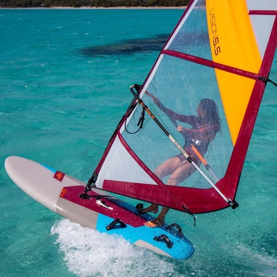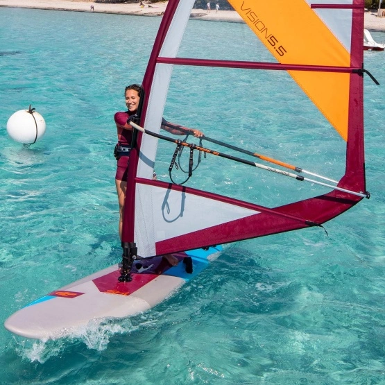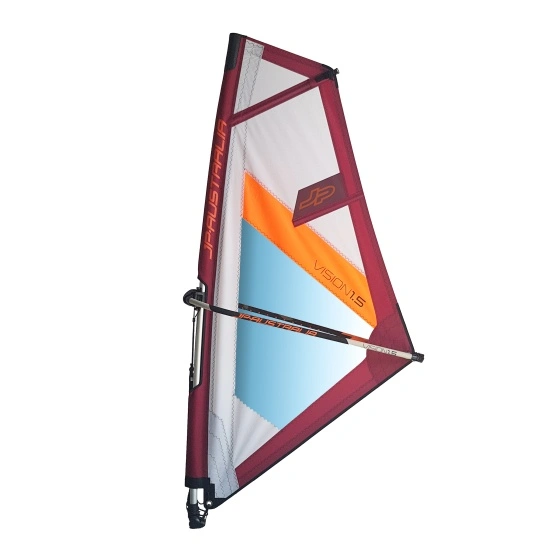 Vision to wydajny i trwały żagiel full-Dacron® z oknem z PVC, ilość listew jest indywidualnie dopasowana do każdego rozmiaru. Charakteryzuje się niską wagą, mocną, odporna na promieniowanie UV i bardzo trwała podczas codziennego użytkowania konstrukcją. Świetnie sprawdzi się w ośrodkach windsurfingowych. Miękki materiał żagla zapewnia świetną duże wsparcie początkującym riderom, wybaczając sporo błędów. Bom ma zmniejszoną średnicę, dzięki czemu dzieci z łatwością mogą go utrzymać, a dwukolorowy uchwyt pomaga rozróżnić prawy i lewy hals.