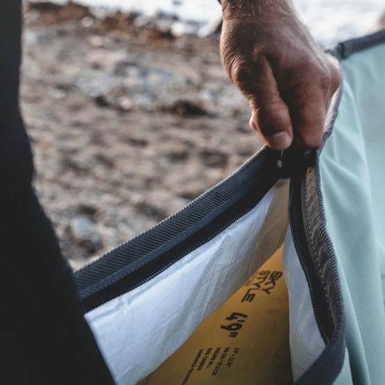 Nie musisz demontować foila na czas transportu! Pokrowiec posiada specjalny slot, który umożliwia schowanie deski bez konieczności zdejmowania foila