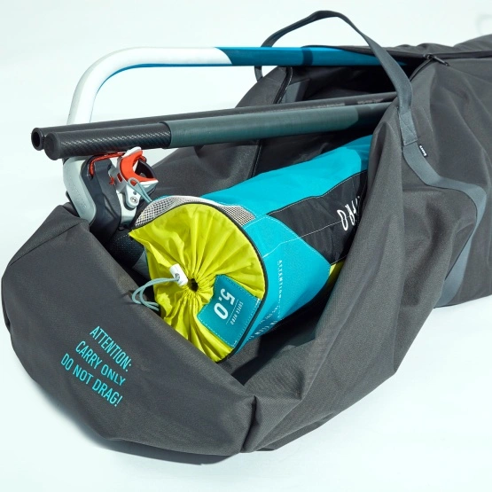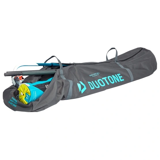 Duotone Flight Light top super lekki, prosty pokrowiec z wszytymi rączkami (około 70% – 3kg lżejszy od standardowych pokrowców) pozwalający zmieścić się w restrykcyjnych limitach wagowych podczas podróży samolotem. Windsurfingowy Quiverbag zapewnia miejsce na żagiel, maszt, bom i mnóstwo części zamiennych.