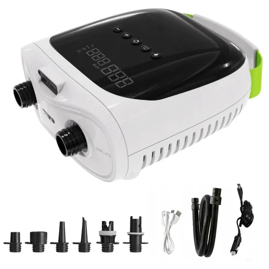 Pompka elektryczna PaddleboardGuru 9+ 12V z wbudowaną baterią – idealna do pompowania desek SUP, kajaków, pontonów i innych nadmuchiwanych akcesoriów. Umożliwia precyzyjne ustawienie ciśnienia do 20 psi, a dzięki wbudowanej baterii zapewnia pełną niezależność od zasilania samochodowego. Dodatkowo, może służyć jako powerbank i latarka.