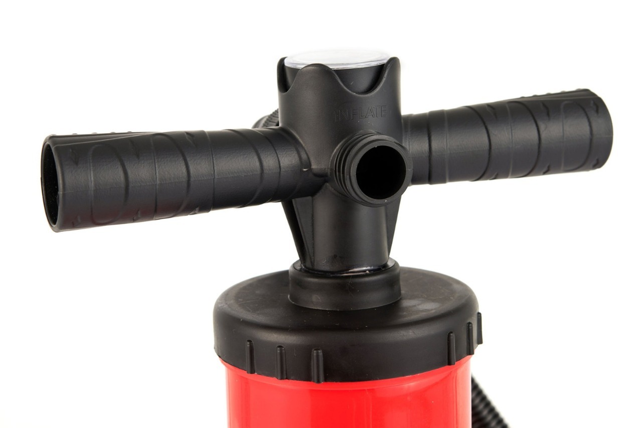 Ergonomiczna i łatwa w użyciu pompka ręczna do kajaków i pontonów z w budowanym manometrem oraz 5 wymiennymi końcówkami. Tryb Double Action zwiększa wydajność pompując w dwóch kierunkach (1,4 l + 1,4 l), a czytelny manometr zapewnia precyzję w pompowaniu sprzętów do 14.5 psi.