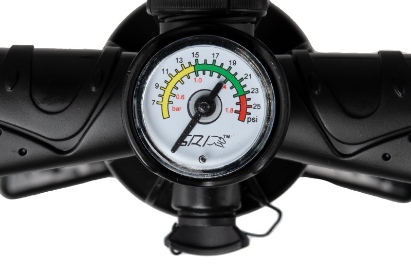 Solidna pompka ręczna do desek SUP pozwalająca osiągnąć maksymalne ciśnienie 26 psi.