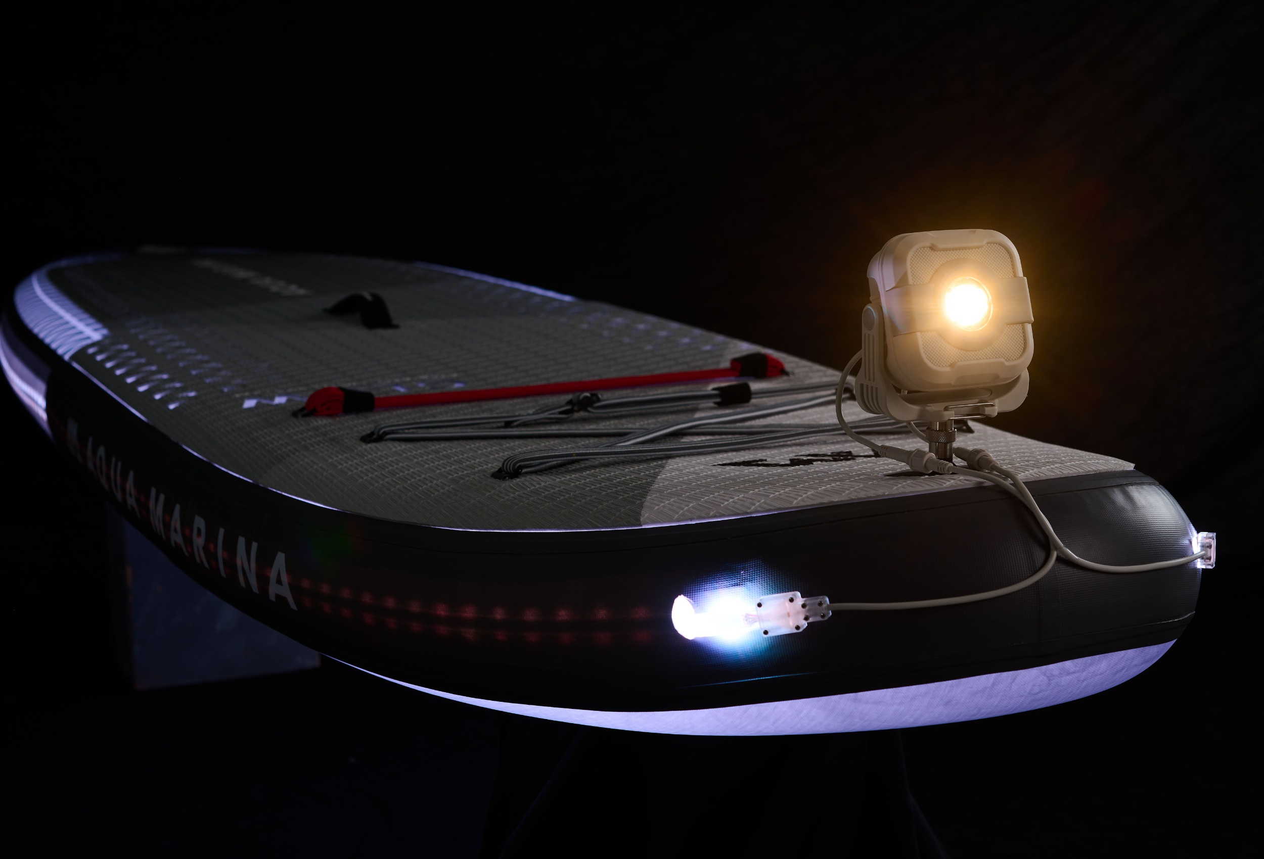 Na dziobie deski umieszczona została lampa LED, która pełni funkcję akumulatora całego oświetlenia deski. Dzięki innowacyjnego systemowi możesz pływać na paddleboardzie całą noc