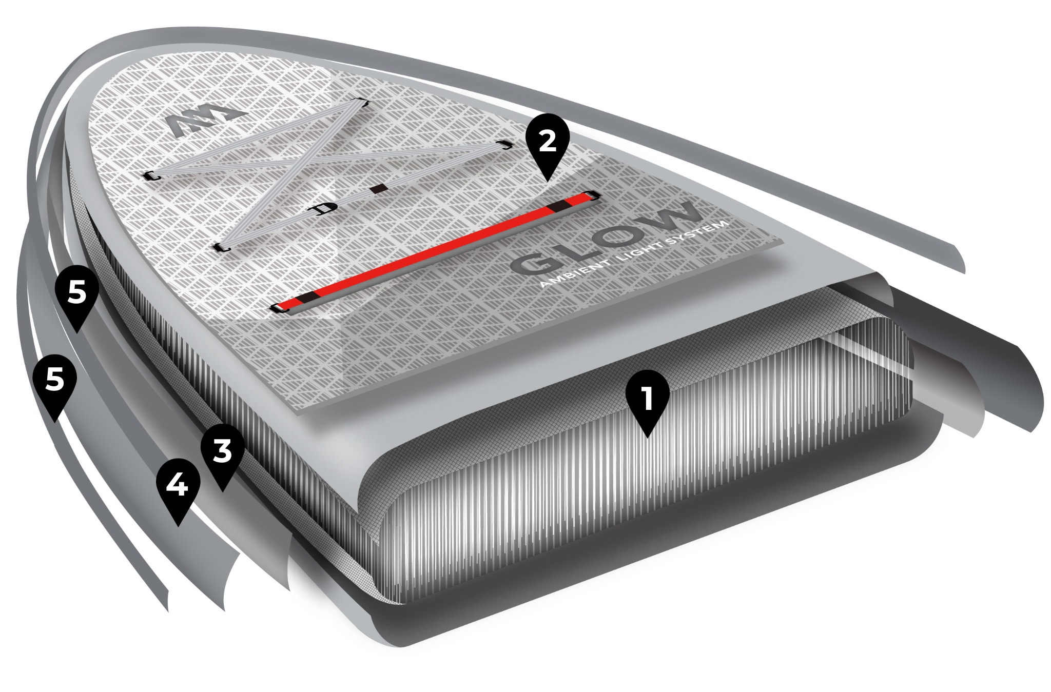 Oświetlenie Ambient Light System™ to zaprojektowane w pokładzie żarówki LED, które rozświetlają całą powierzchnię deski. Dodatkowo, na przedniej części znajduje się lampa LED, która pełni funkcję zasilania całego oświetlenia.