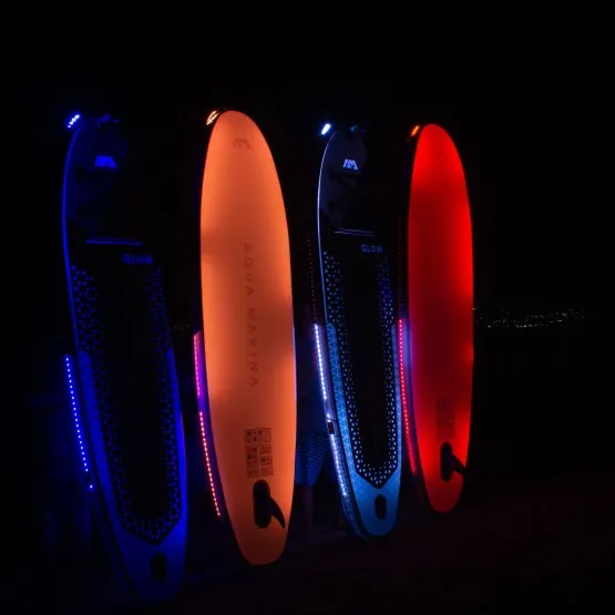 Podświetl swoje nocne wycieczki dzięki unikalnej desce SUP. GLOW posiada aż 6 różnych kolorów oświetlenia oraz 4 różne tryby pracy. Dodatkowo na przodzie umieszczona jest mocna lampa LED, która rozświetli przed Wami całą trasę, jaką zaplanowaliście. Oświetlenie możesz wygodnie kontrolować za pomocą pilota zdalnego sterowania. Podświetl SUP’a i cały brzeg swoim ulubionym kolorem i pływaj całą noc.