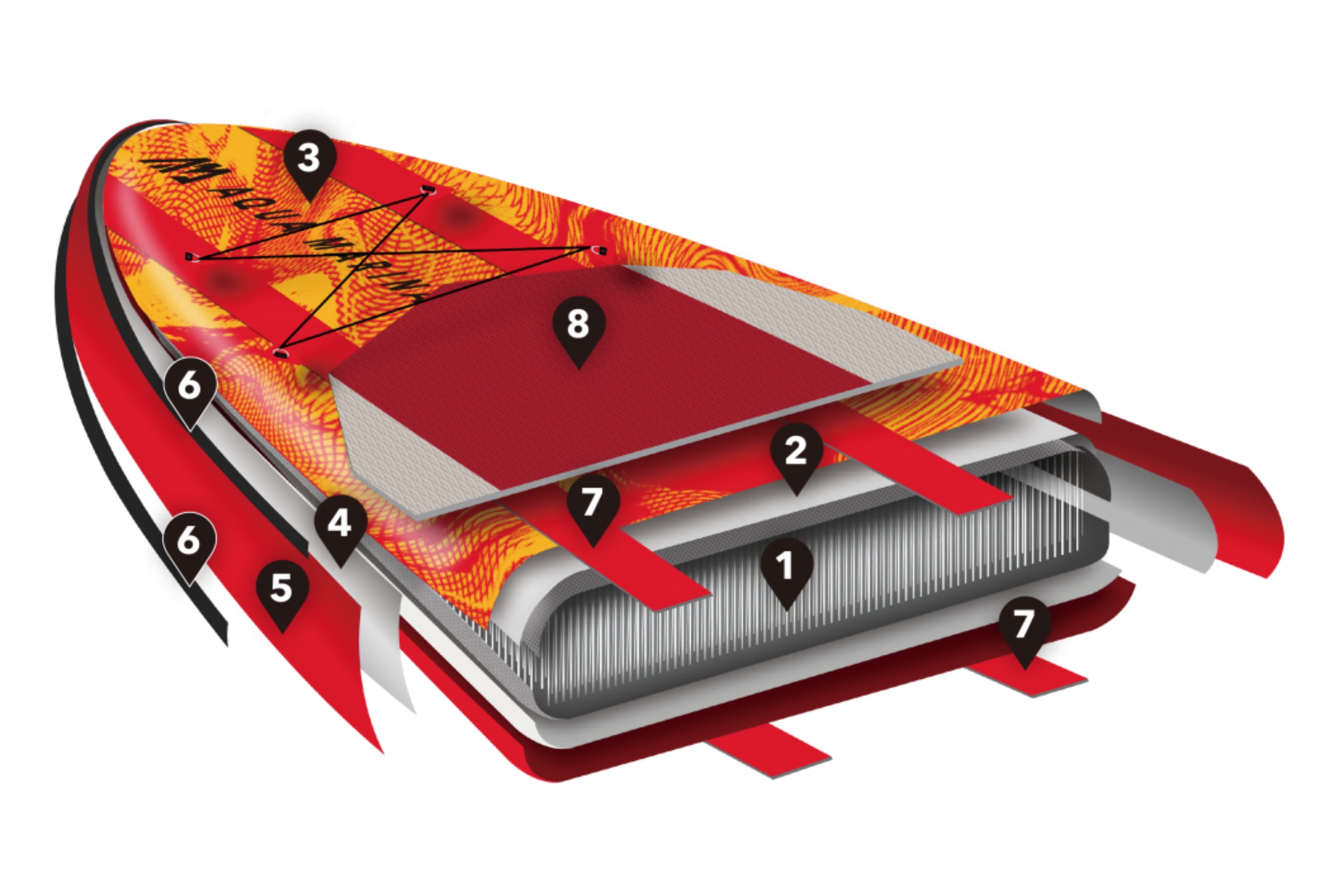 Aqua Marina wykorzystała w tym paddelboardzie technologię Double Layer, można ją napompować do 18 PSI. Dzięki tej konstrukcji deska jest bardzo sztywna, w konsekwencji poczujesz się stabilnie. W produkcji wykorzystano dwuwarstwową technologię Drop-Stitch ze wzmocnionymi panelami bocznymi, na których znajduje się trzecia warstwa ochronna z PVC.