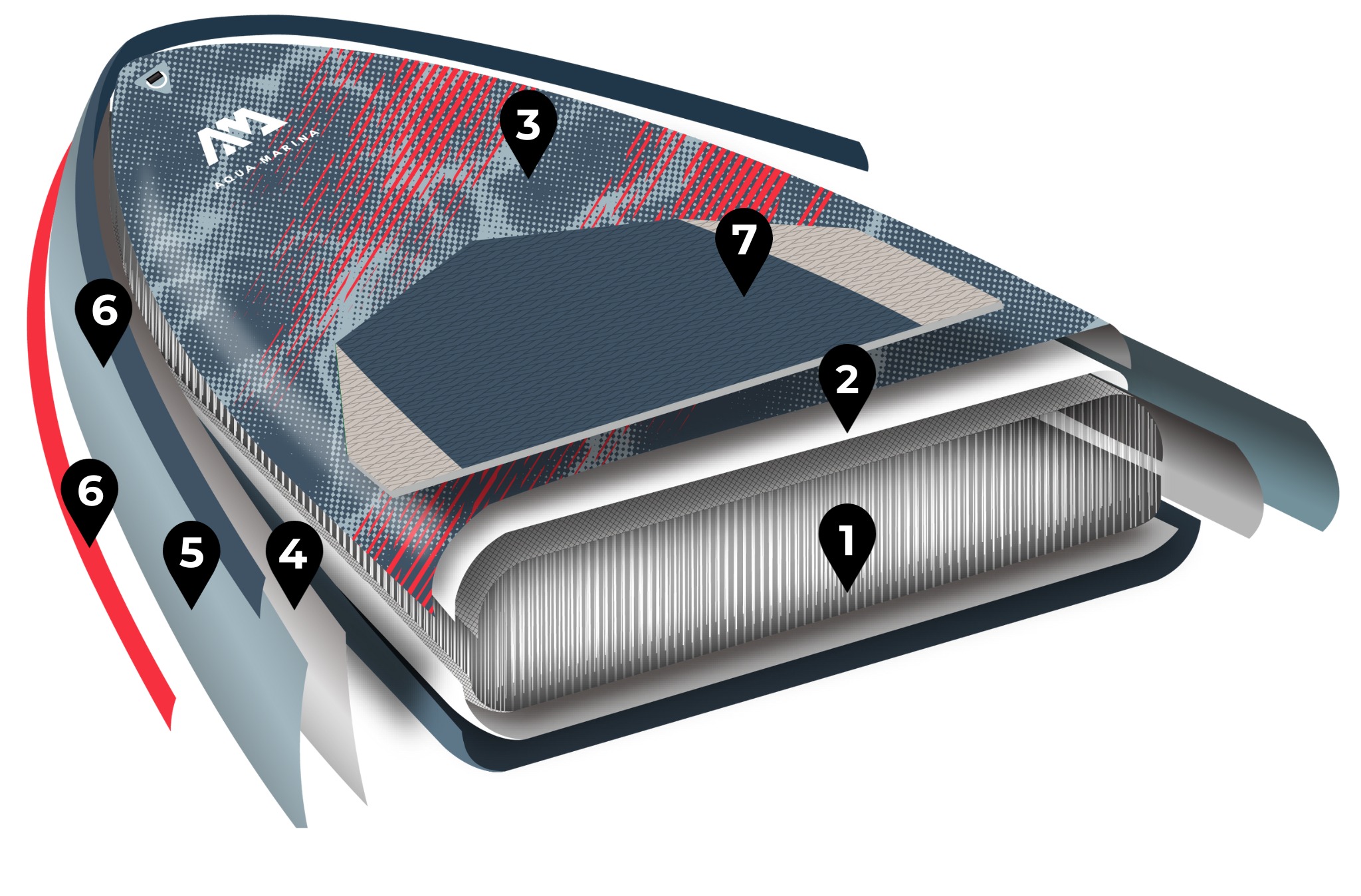 Drop Stitch Technology to tysiące włókien poliestrowych, które po napompowaniu deski tworzą sztywną i odporną konstrukcję. Dodatkowe wzmocnienie burt pasami PVC
