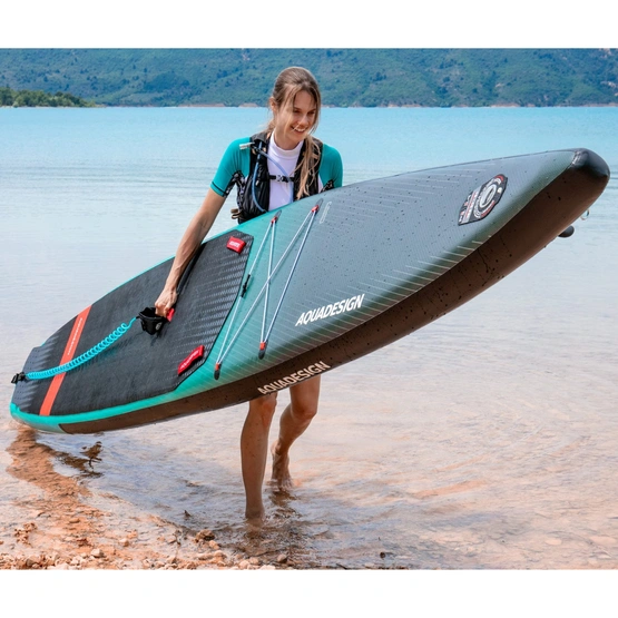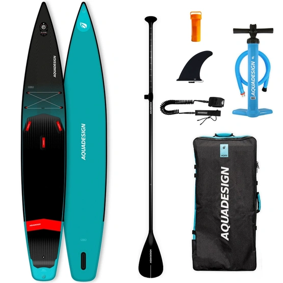 Deska SUP AQUADESIGN First 14'0" to rasowy model race dla zaawansowanych użytkowników. Łączy osiągi sztywnej deski wyścigowej z mobilnością modelu pompowanego. Zestaw zawiera wszystko, co potrzebne do pełnej przygody na wodzie, w tym plecak, ręczną pompkę, aluminiowe wiosło, leash, fin oraz zestaw naprawczy. Wyporność deski to 350l.