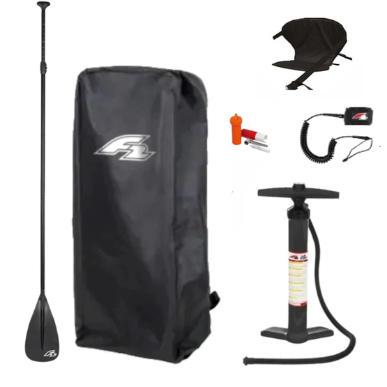 PlecakRęczna pompka z manometremAluminiowe wiosło z dwoma plastikowymi pióramiSiedziskoLeashFinyZestaw naprawczy