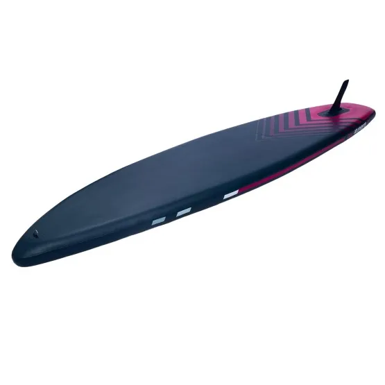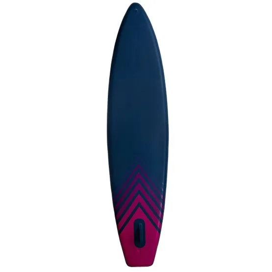 Wymiary: 347x81x12 cm. Zmniejszona wysokość SUP-a (12cm) pozwala lepiej czuć deskę pod stopami, co dodaje pewności siebie przy większych prędkościach. Dodatkowo jest mniej podatna na boczny wiatr i fale uderzające w burty. Pokład pokryty przyjemną w dotyku pianką EVA daje poczucie bezpieczeństwa, chroniąc przed poślizgiem i upadkiem. Praktyczne uchwyty rozmieszczone w różnych częściach deski ułatwiają jej przenoszenie. Bagażnik w postaci elastycznych linek typu bungee pozwala łatwo przewieźć niezbędne akcesoria oraz zamocować wiosło w chwilach wolnych od wiosłowania.