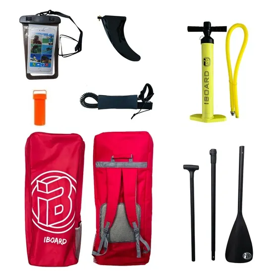 Deskę SUP iBoardPlecak transportowyRęczna pompkę z manometremTrzyczęściowe aluminiowe wiosłoLeashStatecznik typu US-BOXZestaw naprawczy (łatki i klucz do zaworu)Wodoodporne etui na telefon
