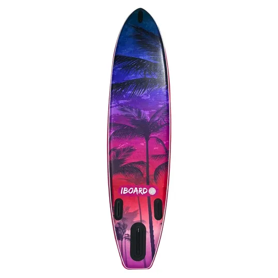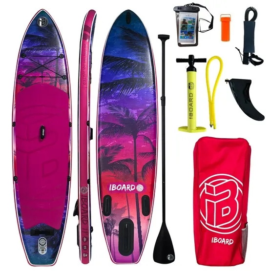 iBOARD 11′ Purple Palm to pompowana deska SUP, który przedstawia zachód słońca na tle palm. Deska jest odpowiednia do rekreacyjnego wiosłowania po jeziorach, spokojnych rzekach i przybrzeżnych zatokach. Deska jest zaprojektowana zarówno dla początkujących, jak i użytkowników średniozaawansowanych. Zestaw zawiera wszystkie niezbędne akcesoria, aby rozpocząć swoją wodną przygodę (plecak, wiosło, pompa, smycz, fin, zestaw naprawczy oraz wodoodporna torba na telefon).