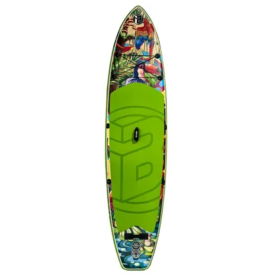 Długość 11′ i umiarkowana szerokość gwarantują dobry kompromis między stabilnością a płynnością wiosłowania. Wykonana w technologii drop-stitch, deska jest lekka, sztywna i odporna na odkształcenia. Antypoślizgowy pokład EVA zapewnia pewne podparcie dla stóp, a elastyczne linki bungee umożliwiają zabranie bagażu lub sprzętu na wycieczki. Deska SUP wyposażona jest w jeden wyjmowany statecznik w systemie US-Box (mocowanie za pomocą wkręcanej śruby), oraz dwa mniejsze zamontowane na stałe.