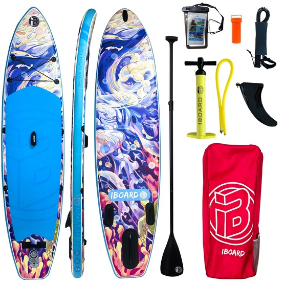 Deskę SUP iBoardPlecak transportowyRęczna pompkę z manometremTrzyczęściowe aluminiowe wiosłoLeashStatecznik typu US-BOXZestaw naprawczy (łatki i klucz do zaworu)Wodoodporne etui na telefon