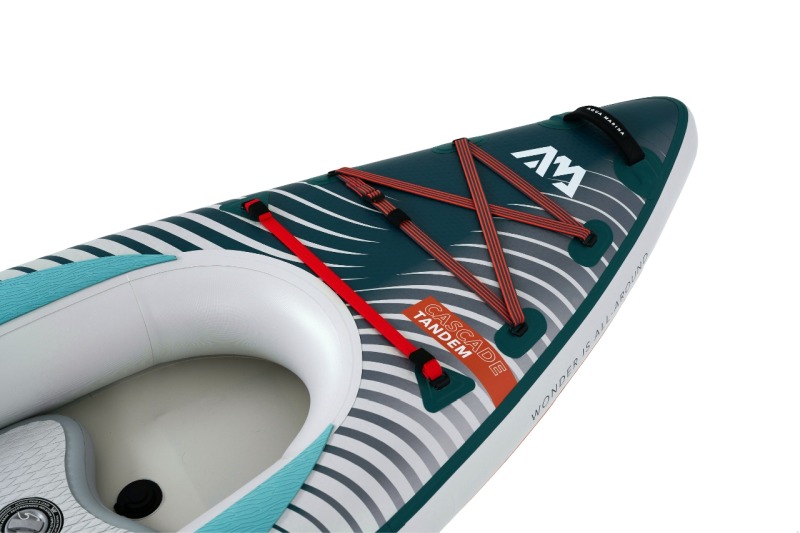 Cascade Tandem został wyprodukowany z zastosowaniem innowacyjnej technologii Drop Stitch Light, która zapewnia doskonałą wytrzymałość, lekkość i sztywność deski. Każda komora kajakowa posiada zawór spustowy do usuwania wody z pokładu.