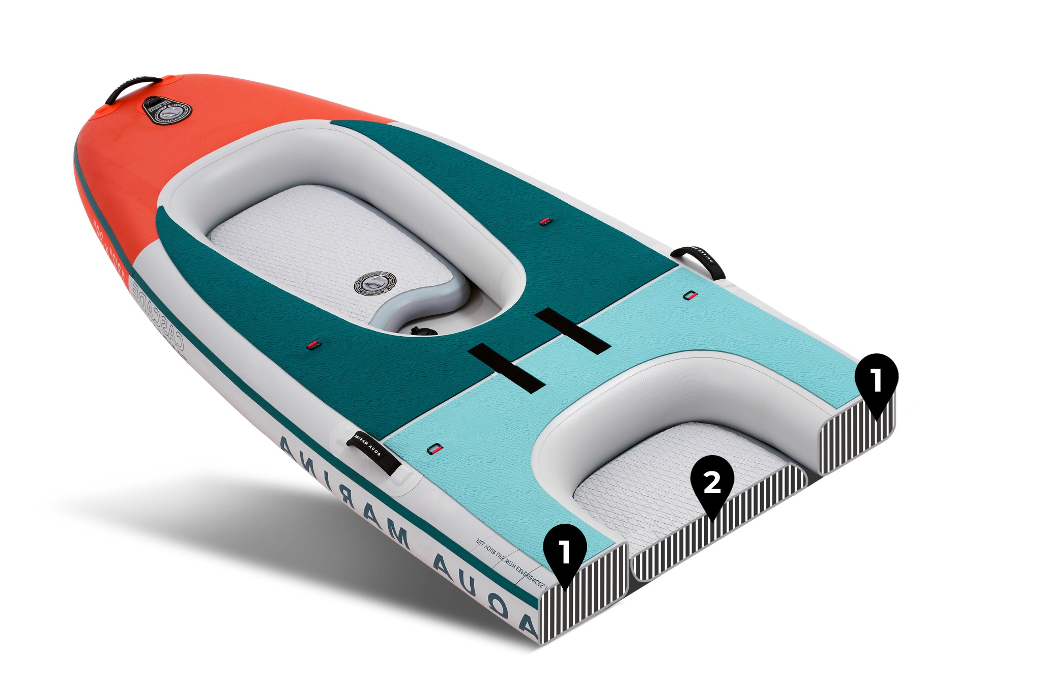 DESKA SUP: Możecie pływać na stojąco, stojąc w komorach deski. Początkujący wioślarze mogą wyjąć podkładkę z komory, by stanąć na dolnym pokładzie – wówczas, dzięki niżej położonemu środkowi ciężkości wiosłowanie na stojąco jest bardziej stabilne i każdy użytkownik poczuje się pewniej. Jeśli płyniesz w pojedynkę i jesteś już nieco wprawionym paddlerem – stań na wyższym pokładzie, na samym środku. Nie musisz obawiać się o poślizgnięcie – pianka EVA zapewni Twoim stopom świetną przyczepność.