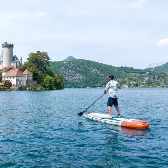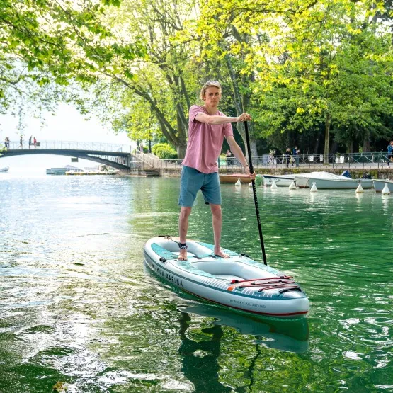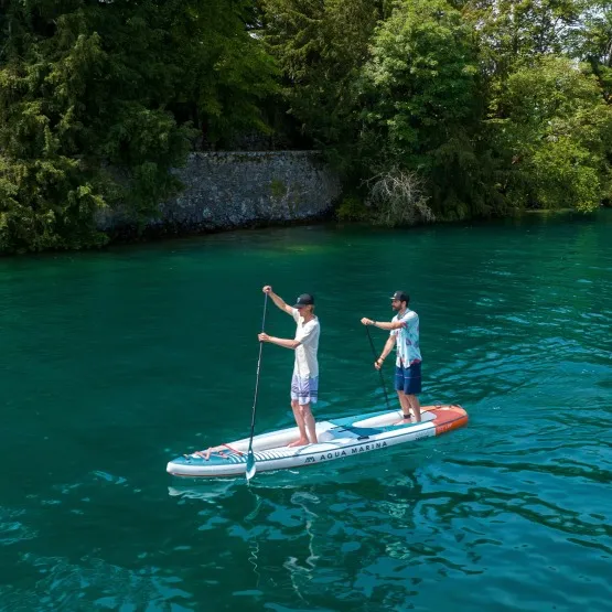 DESKA SUP: Możecie pływać na stojąco, stojąc w komorach deski. Początkujący wioślarze mogą wyjąć podkładkę z komory, by stanąć na dolnym pokładzie – wówczas, dzięki niżej położonemu środkowi ciężkości wiosłowanie na stojąco jest bardziej stabilne i każdy użytkownik poczuje się pewniej. Jeśli płyniesz w pojedynkę i jesteś już nieco wprawionym paddlerem – stań na wyższym pokładzie, na samym środku. Nie musisz obawiać się o poślizgnięcie – pianka EVA zapewni Twoim stopom świetną przyczepność.