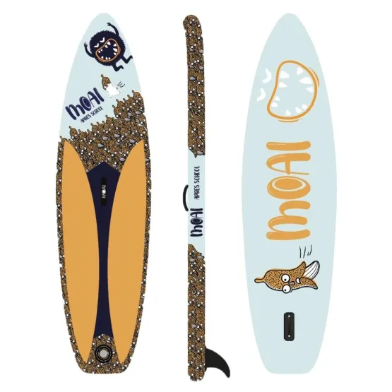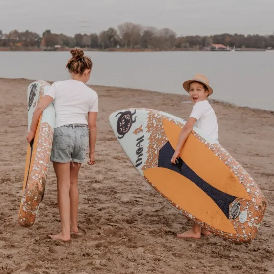 Pompowany SUP Moai Kids 8'2 ‘Let’s go bananas’ stworzony z myślą o najmłodszych miłośnikach wodnych przygód. Wielkość i konstrukcja deski sprawiają, że młodzi paddlerzy będą czuć się bezpiecznie i z łatwością przyjdzie im manewrowanie deską. Idealnie nadaje się do pływania po spokojnych jeziorach, jak i do łapania mniejszych fal. Wyporność wynosi 140 litrów, co daję maksymalne obciążenie 60 kg.
