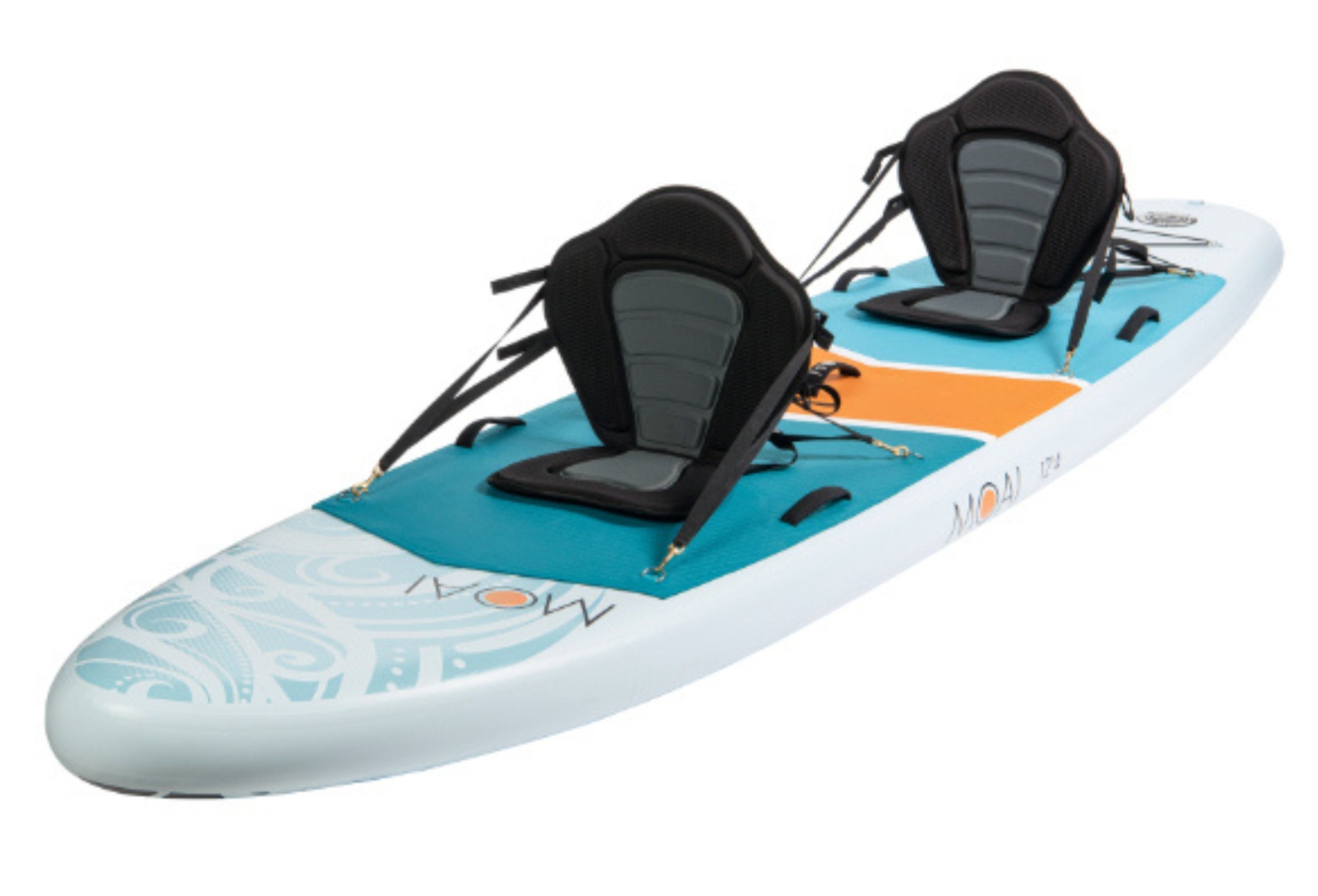 Dwuosobowy, pompowany SUP Moai Multiperson 12’4 zaprojektowany z myślą o rekreacyjnym wiosłowaniu, łączy w sobie paddelboarding z kajakarstwem. W szybki sposób przekształcisz go w sportowy kajak. Jej wielkość gwarantuje wystarczającą ilość miejsca na pokładzie, i mimo swoich gabarytów, deska jest zwrotna i szybka. Wyporność deski wynosi 350 litrów, co daję maksymalne obciążenie 190 kg.